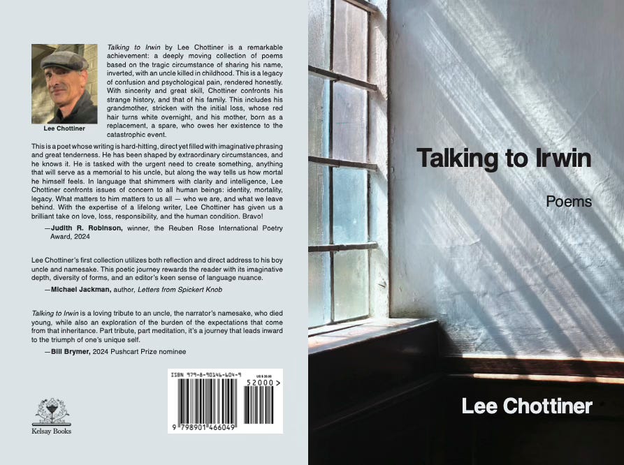 "Talking to Irwin" is a collection of poems about the tragic death of my boy uncle--my namesake--nearly a century ago and how its impact resonates in my family to this day